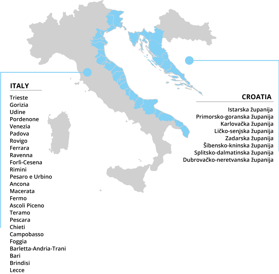 The INTERREG Italy-Croatia Programme area comprises parts of the territory of Italy and Croatia. In particular the participating territories are 33 statistical NUTS III territories (25 provinces in Italy and 8 counties in Croatia).